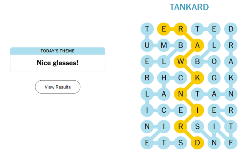 The spangram runs across the board and captures the overall theme of the puzzle. Every answer word represents a type of vessel used for serving beverages, from everyday glasses to classic bar mugs.