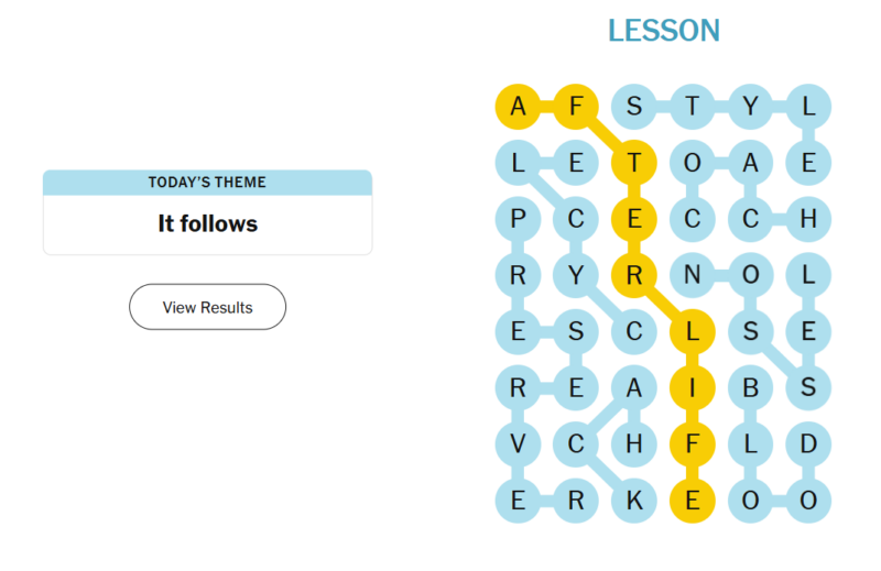 Today’s theme leaned into the idea of things that come after or continue from something else. The puzzle had a slightly abstract feel, mixing literal and figurative “follow-ups.” Some words were more straightforward, while others required thinking about what typically comes next in a sequence or process.