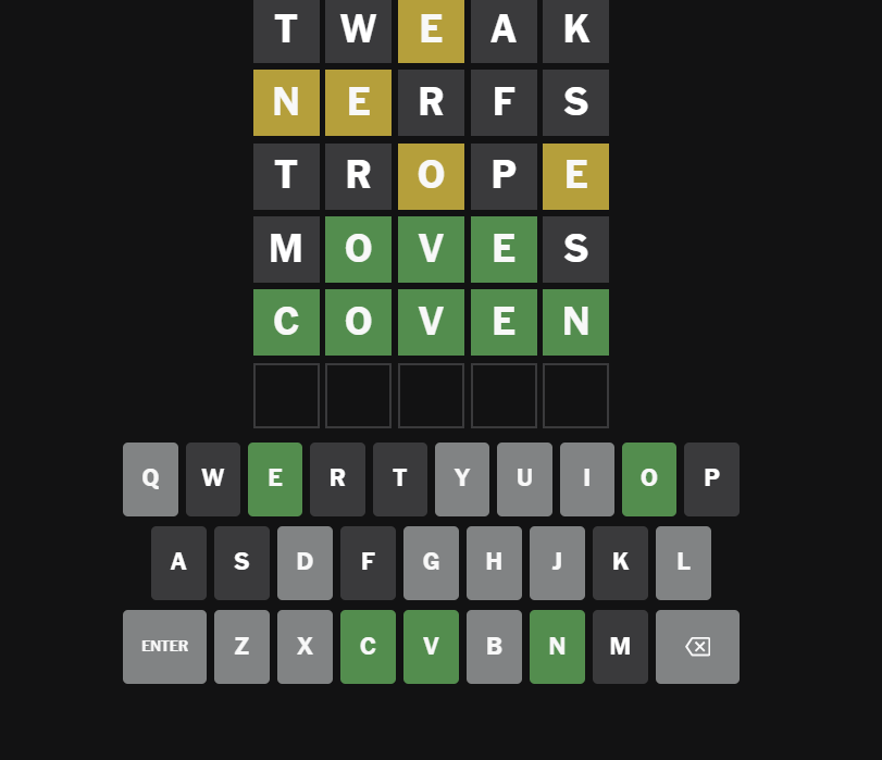Today’s Wordle had a magical undertone, leading many players down fascinating guess paths. Early grids were full of words like token, woven, or coven’s near cousins, and then — click.