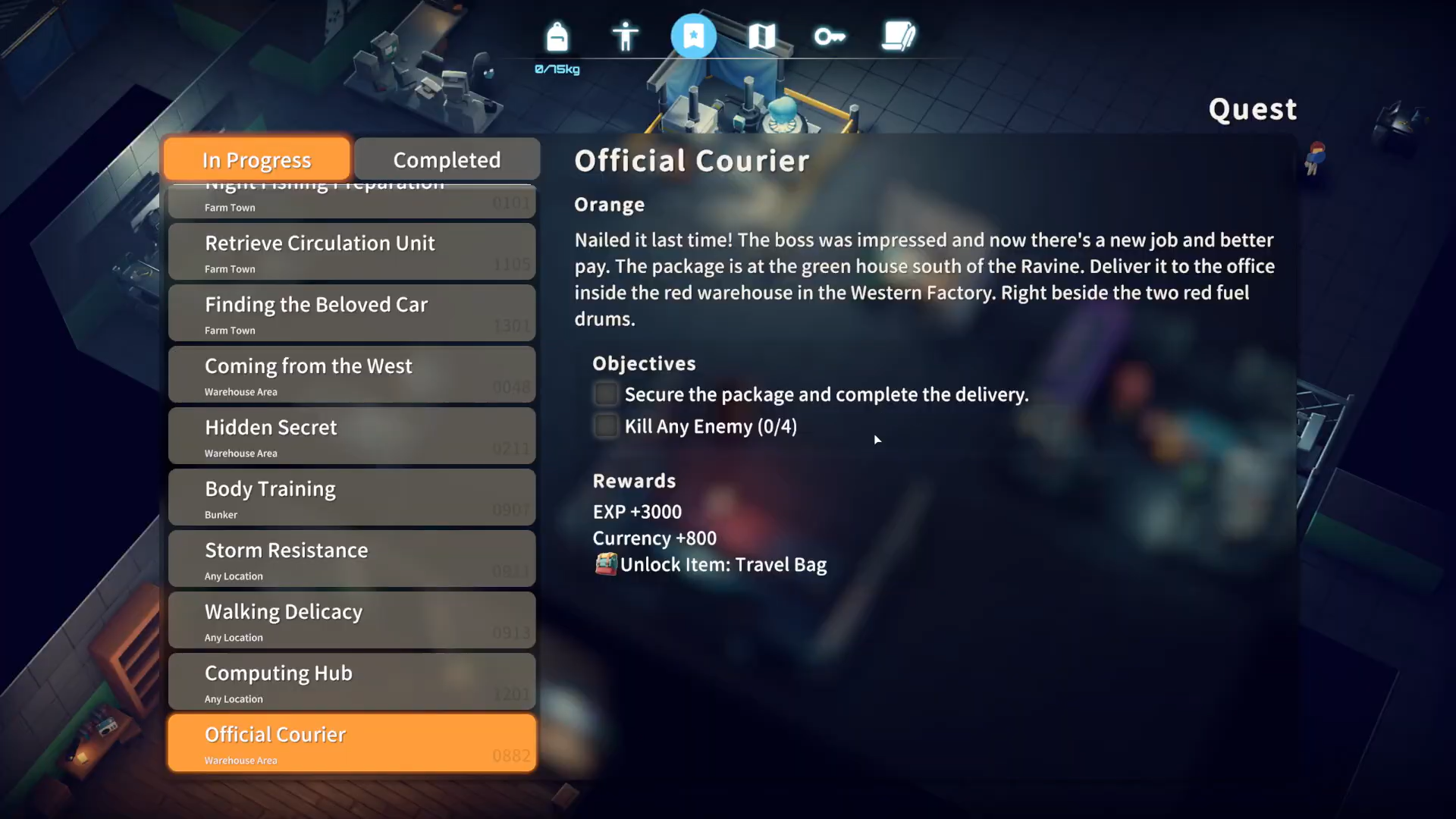 The quest “Official Courier” is given by Orange in the Warehouse Area. You’ll deliver a package from the Ravine to the Western Factory for increased pay and valuable rewards including a Travel Bag.