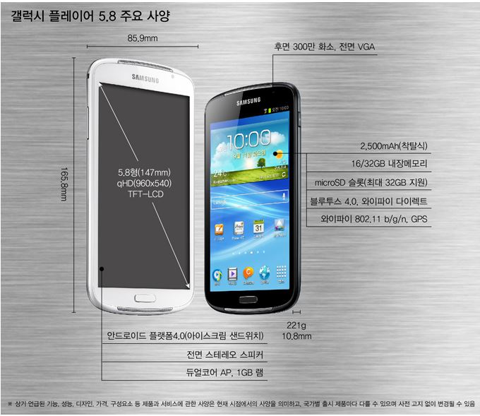 The 5.8″ display however has a resolution of only 960×540, which means it certainly won’t be winning awards for a sharp display. The Galaxy Player 5.8 will be powered by Android 4.0 with Samsung’s TouchWiz customization, stereo front speakers with Samsung’s Sound Alive technology, a VGA camera on the front, 1GB RAM 16/32GB memory, microSD card slot, Wi-Fi, Bluetooth 4.0, GPS, and a 2500 mAh batter to go along which should ensure long lasting operation. The details about the underlying processor wasn’t revealed.