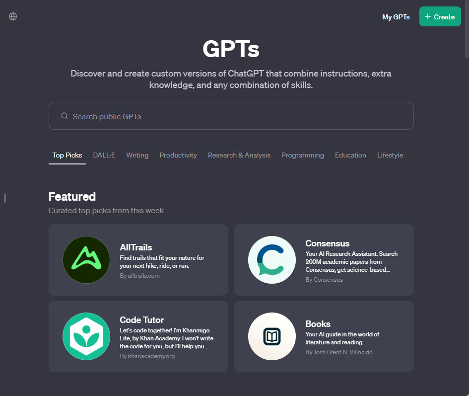The GPT Store opens up to some popular categories such as Top Picks, Trending, DALL.E, Writing, Productivity, Programming, etc. There are also custom GPTs created by the ChatGPT Team. Keep an eye out on the trending and featured GPTs as these will change every week based on the most useful and impactful GPTs.