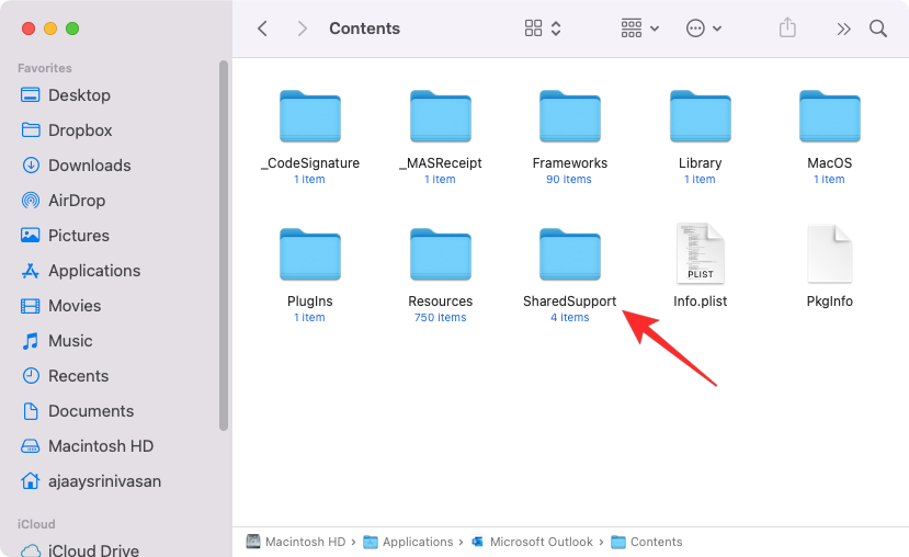 When you locate the Microsoft Outlook app, Control-click or right-click on it and select Show Package Contents.