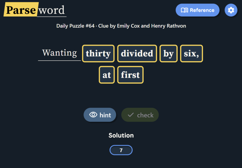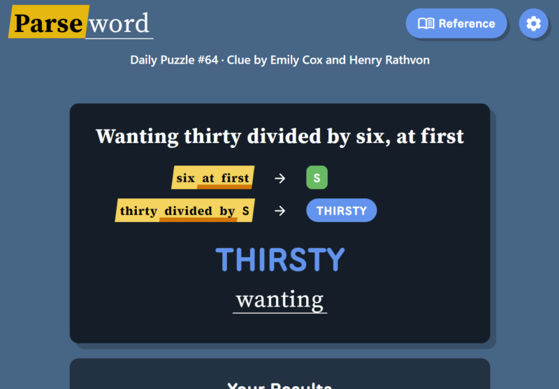 Instead of guessing a word from a grid or filling crossword clues, Parseword gives players a single clue and asks them to interpret the meaning behind it. The clue usually contains both a definition of the answer and instructions for constructing the answer through word transformations.