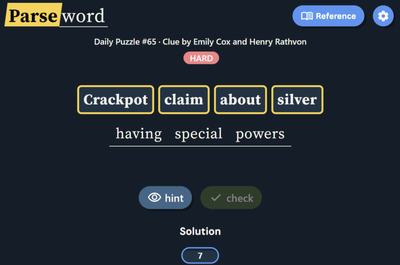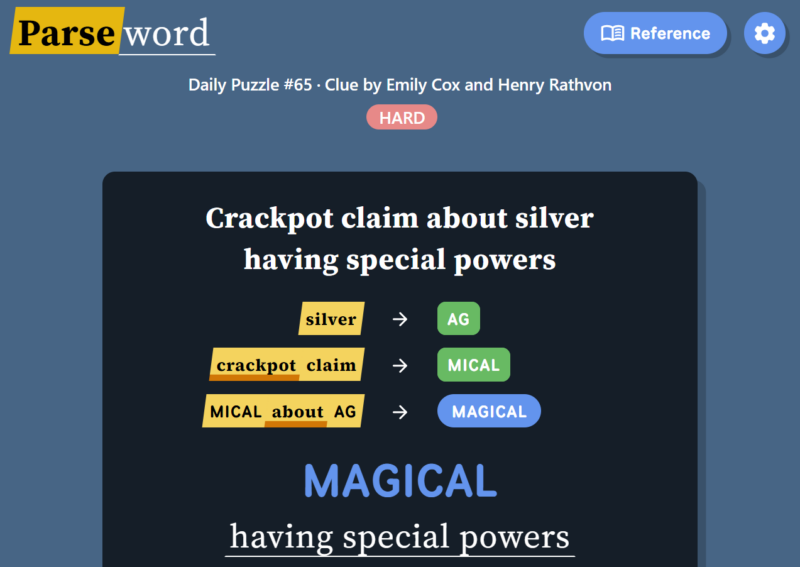Instead of guessing a word from a grid or filling crossword clues, Parseword gives players a single clue and asks them to interpret the meaning behind it. The clue usually contains both a definition of the answer and instructions for constructing the answer through word transformations.