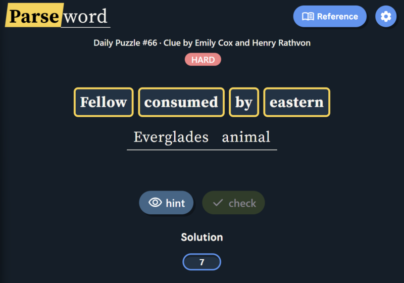 Instead of guessing a word from a grid or filling crossword clues, Parseword gives players a single clue and asks them to interpret the meaning behind it. The clue usually contains both a definition of the answer and instructions for constructing the answer through word transformations.