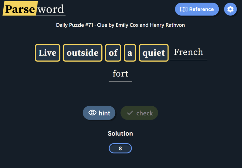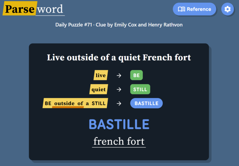 Instead of guessing a word from a grid or filling crossword clues, Parseword gives players a single clue and asks them to interpret the meaning behind it. The clue usually contains both a definition of the answer and instructions for constructing the answer through word transformations.