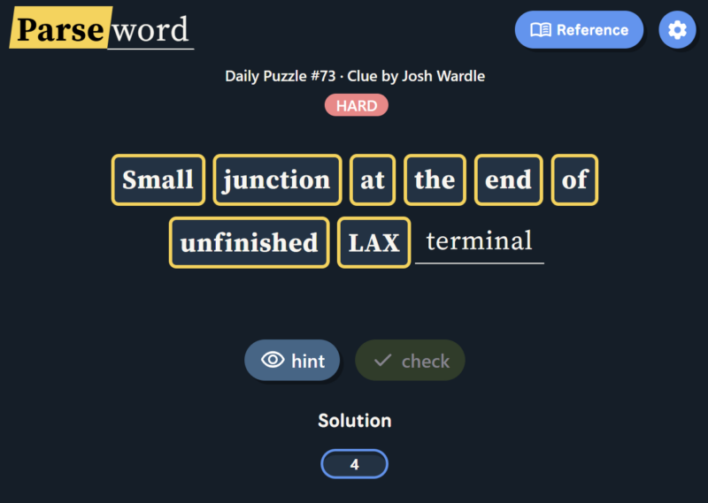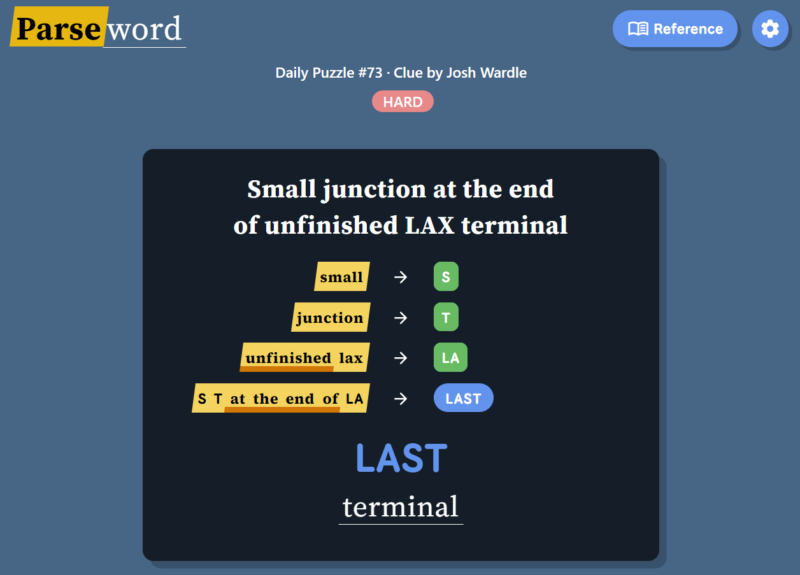 Instead of guessing a word from a grid or filling crossword clues, Parseword gives players a single clue and asks them to interpret the meaning behind it. The clue usually contains both a definition of the answer and instructions for constructing the answer through word transformations.