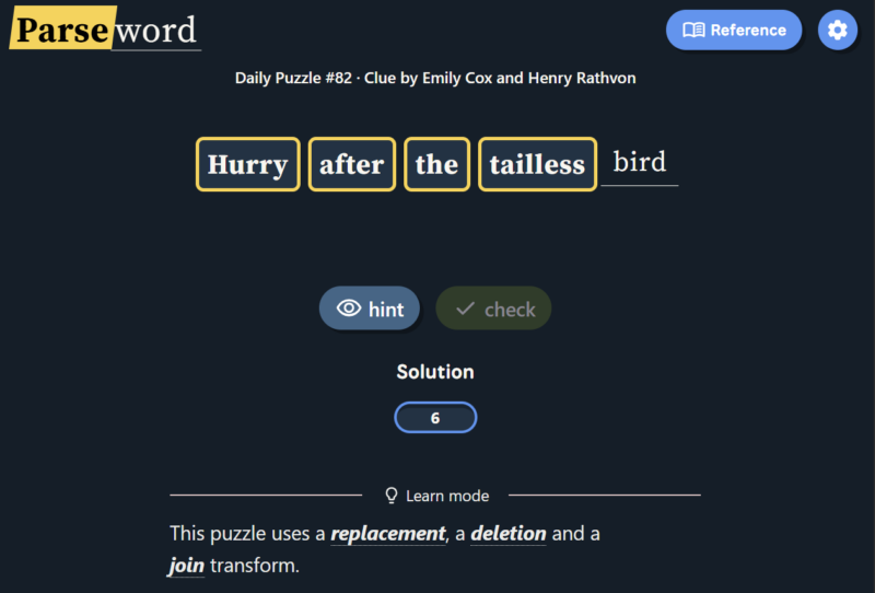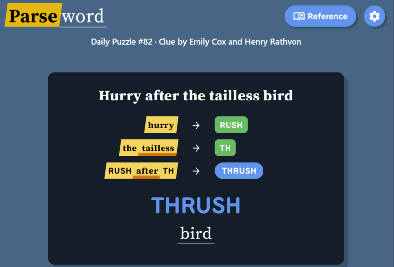 Instead of guessing a word from a grid or filling crossword clues, Parseword gives players a single clue and asks them to interpret the meaning behind it. The clue usually contains both a definition of the answer and instructions for constructing the answer through word transformations.
