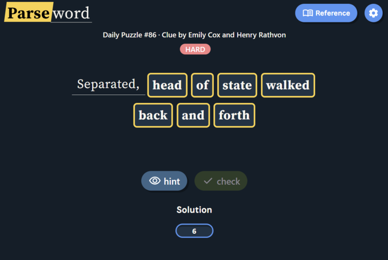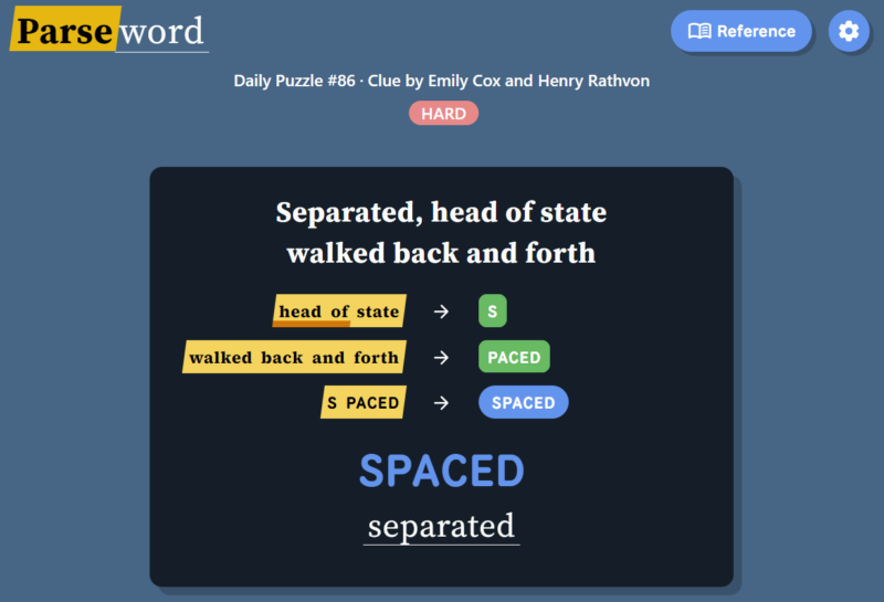 Instead of guessing a word from a grid or filling crossword clues, Parseword gives players a single clue and asks them to interpret the meaning behind it. The clue usually contains both a definition of the answer and instructions for constructing the answer through word transformations.