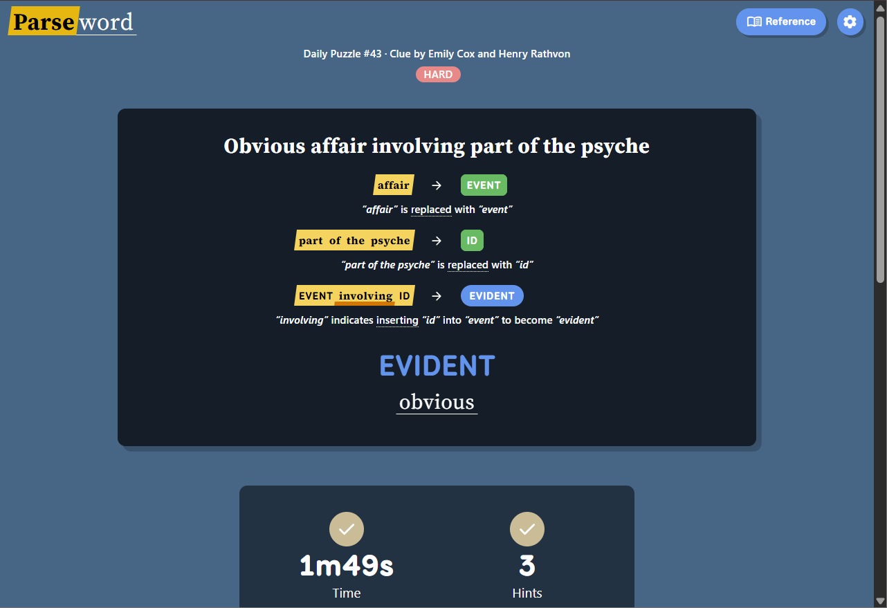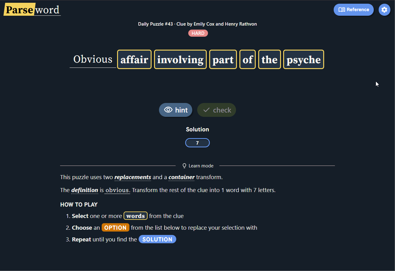 Instead of guessing a word from a grid or filling crossword clues, Parseword gives players a single clue and asks them to interpret the meaning behind it. The clue usually contains both a definition of the answer and instructions for constructing the answer through word transformations.