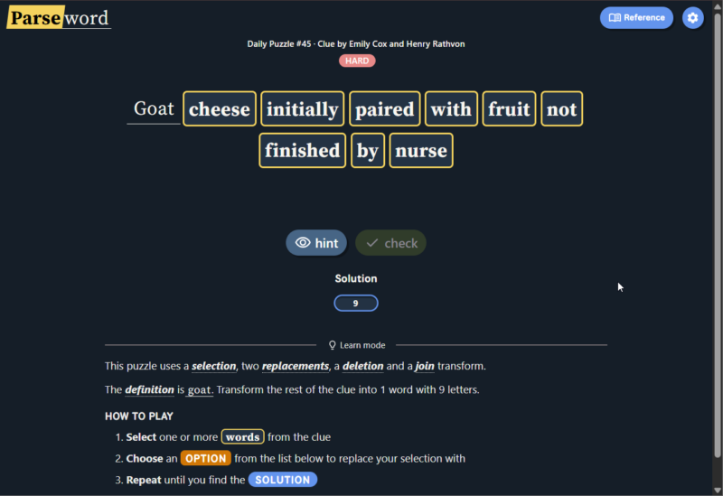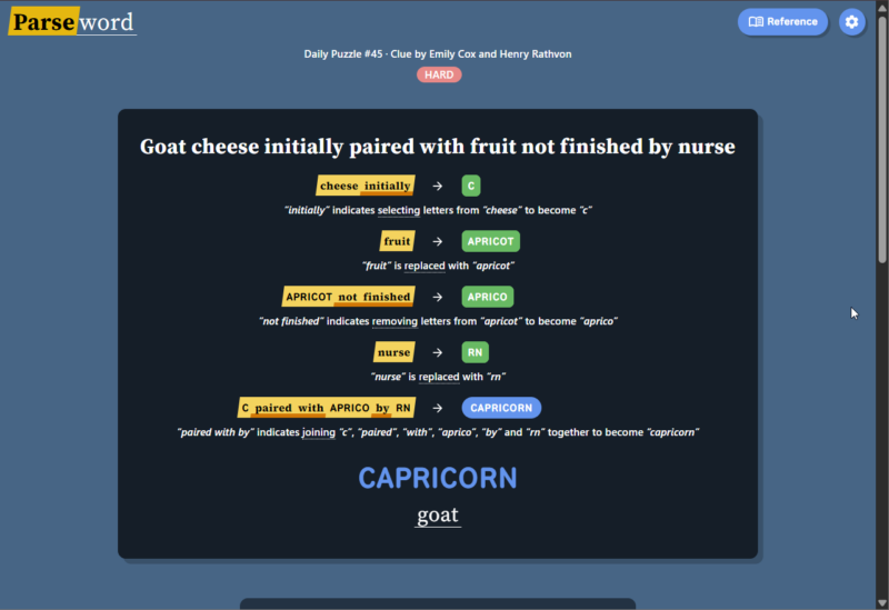 Instead of guessing a word from a grid or filling crossword clues, Parseword gives players a single clue and asks them to interpret the meaning behind it. The clue usually contains both a definition of the answer and instructions for constructing the answer through word transformations.