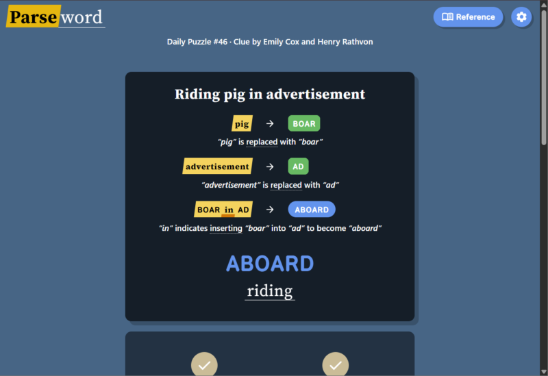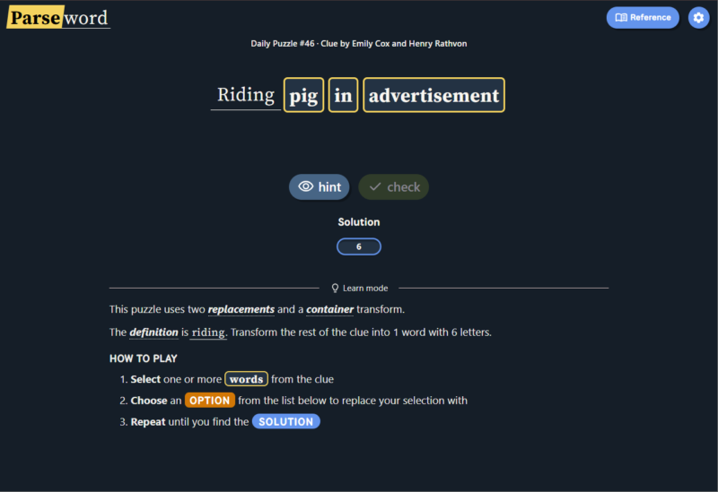Instead of guessing a word from a grid or filling crossword clues, Parseword gives players a single clue and asks them to interpret the meaning behind it. The clue usually contains both a definition of the answer and instructions for constructing the answer through word transformations.