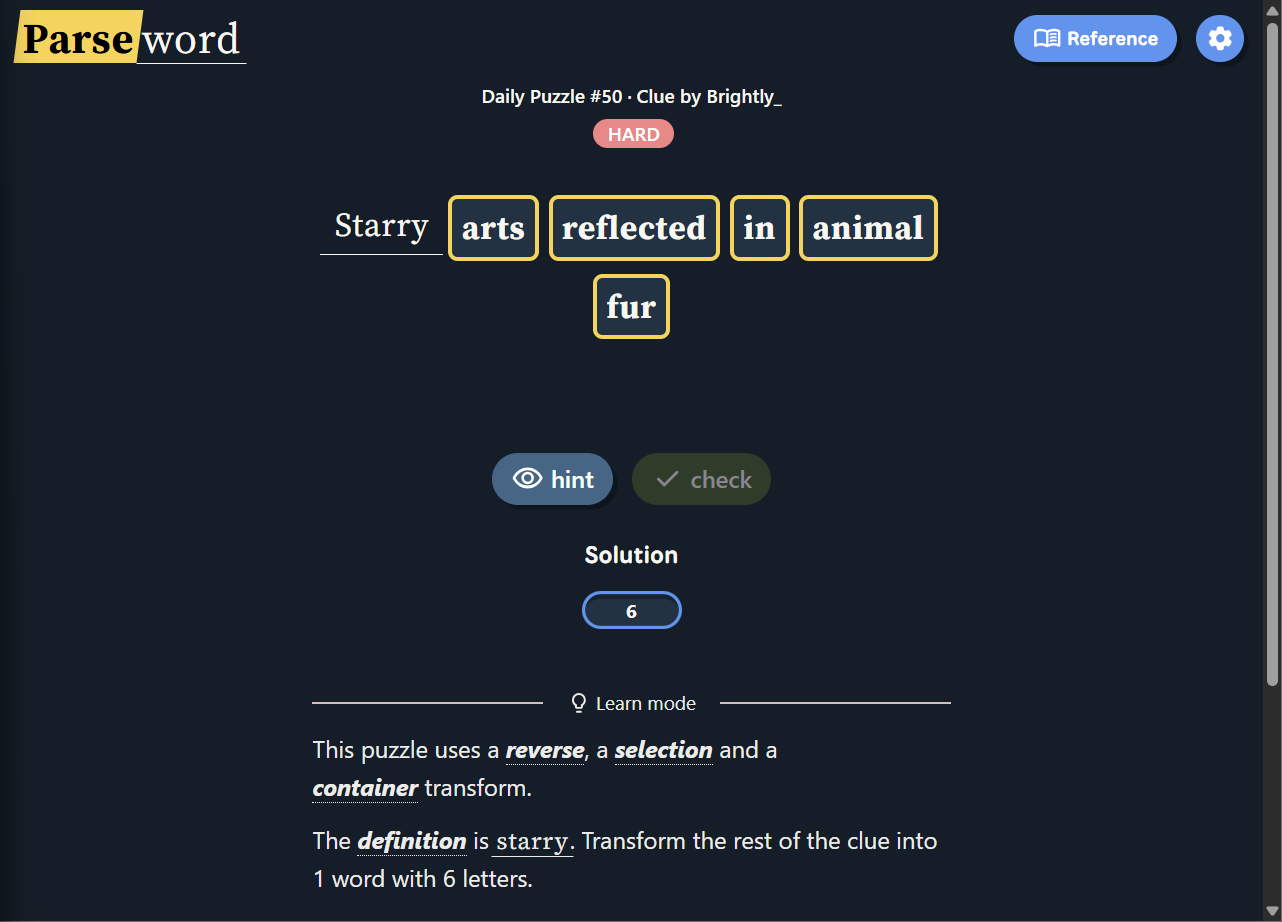 Instead of guessing a word from a grid or filling crossword clues, Parseword gives players a single clue and asks them to interpret the meaning behind it. The clue usually contains both a definition of the answer and instructions for constructing the answer through word transformations.