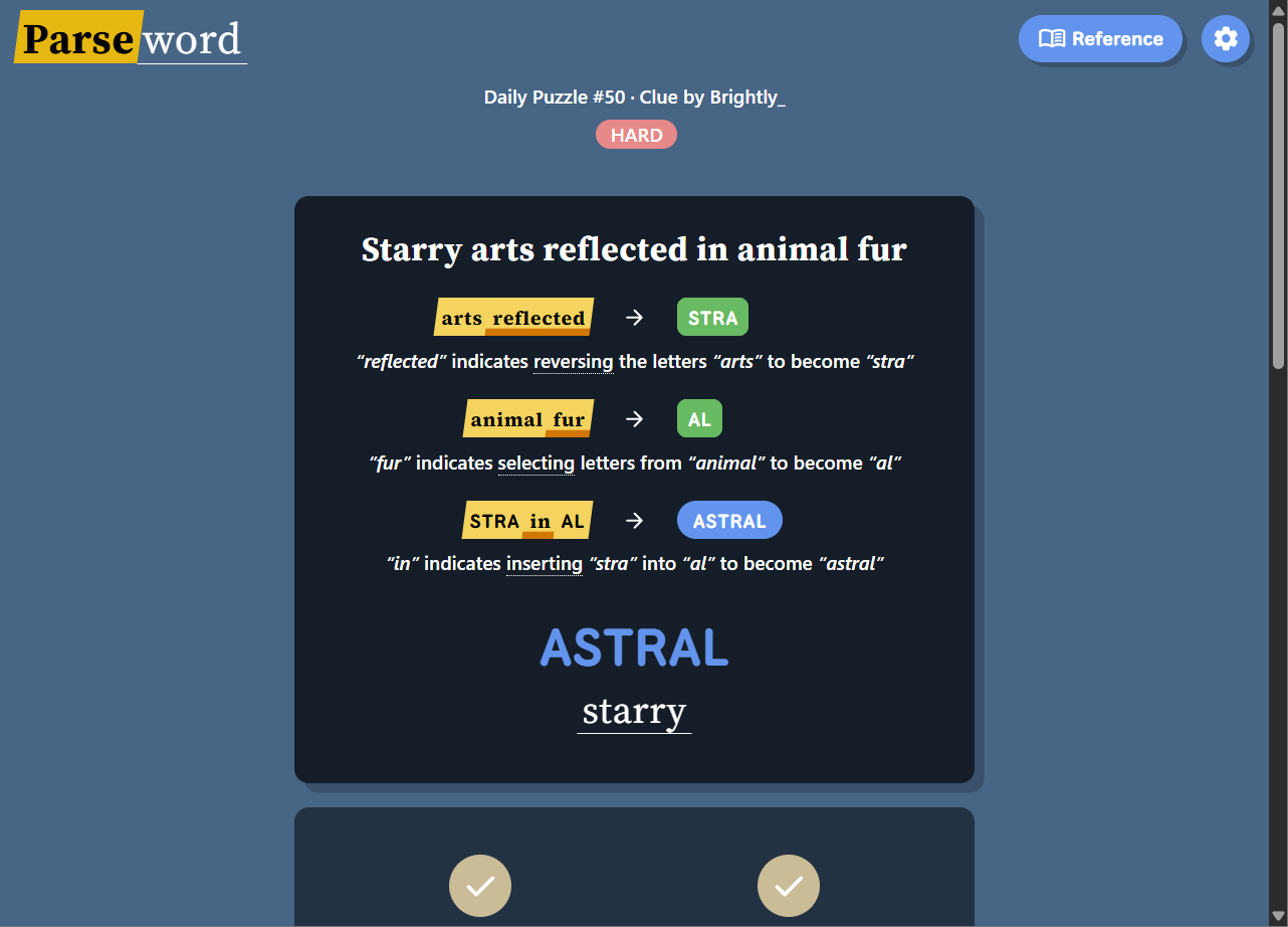 Parseword was designed to introduce players to cryptic-style puzzles in a more accessible way. Many traditional cryptic crosswords can feel intimidating for beginners, but Parseword teaches players how these clues function step by step through daily practice.