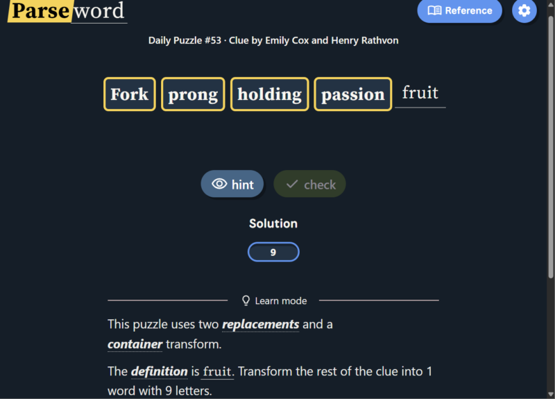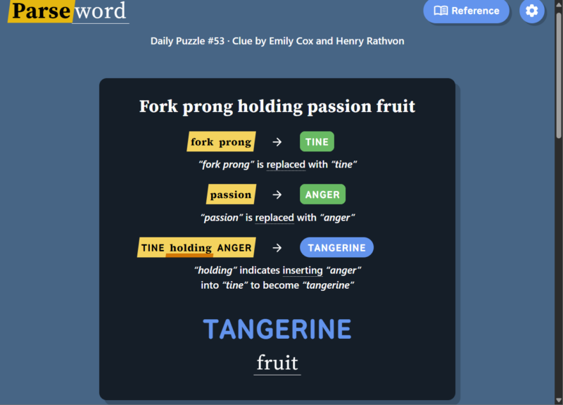 Instead of guessing a word from a grid or filling crossword clues, Parseword gives players a single clue and asks them to interpret the meaning behind it. The clue usually contains both a definition of the answer and instructions for constructing the answer through word transformations.