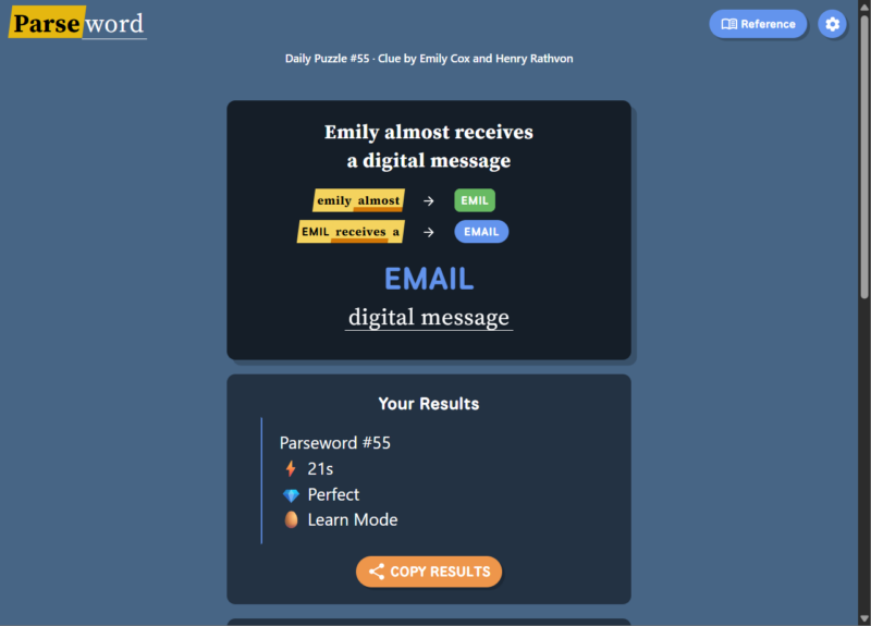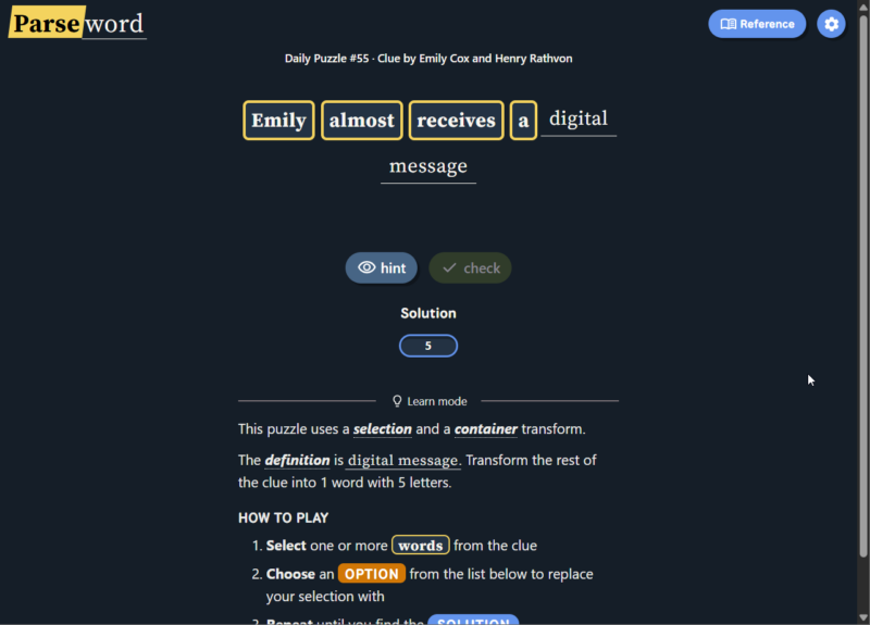 Instead of guessing a word from a grid or filling crossword clues, Parseword gives players a single clue and asks them to interpret the meaning behind it. The clue usually contains both a definition of the answer and instructions for constructing the answer through word transformations.