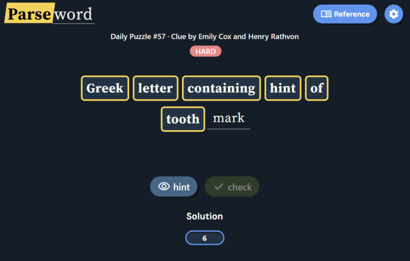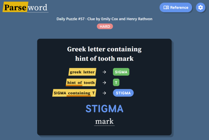 Instead of guessing a word from a grid or filling crossword clues, Parseword gives players a single clue and asks them to interpret the meaning behind it. The clue usually contains both a definition of the answer and instructions for constructing the answer through word transformations.