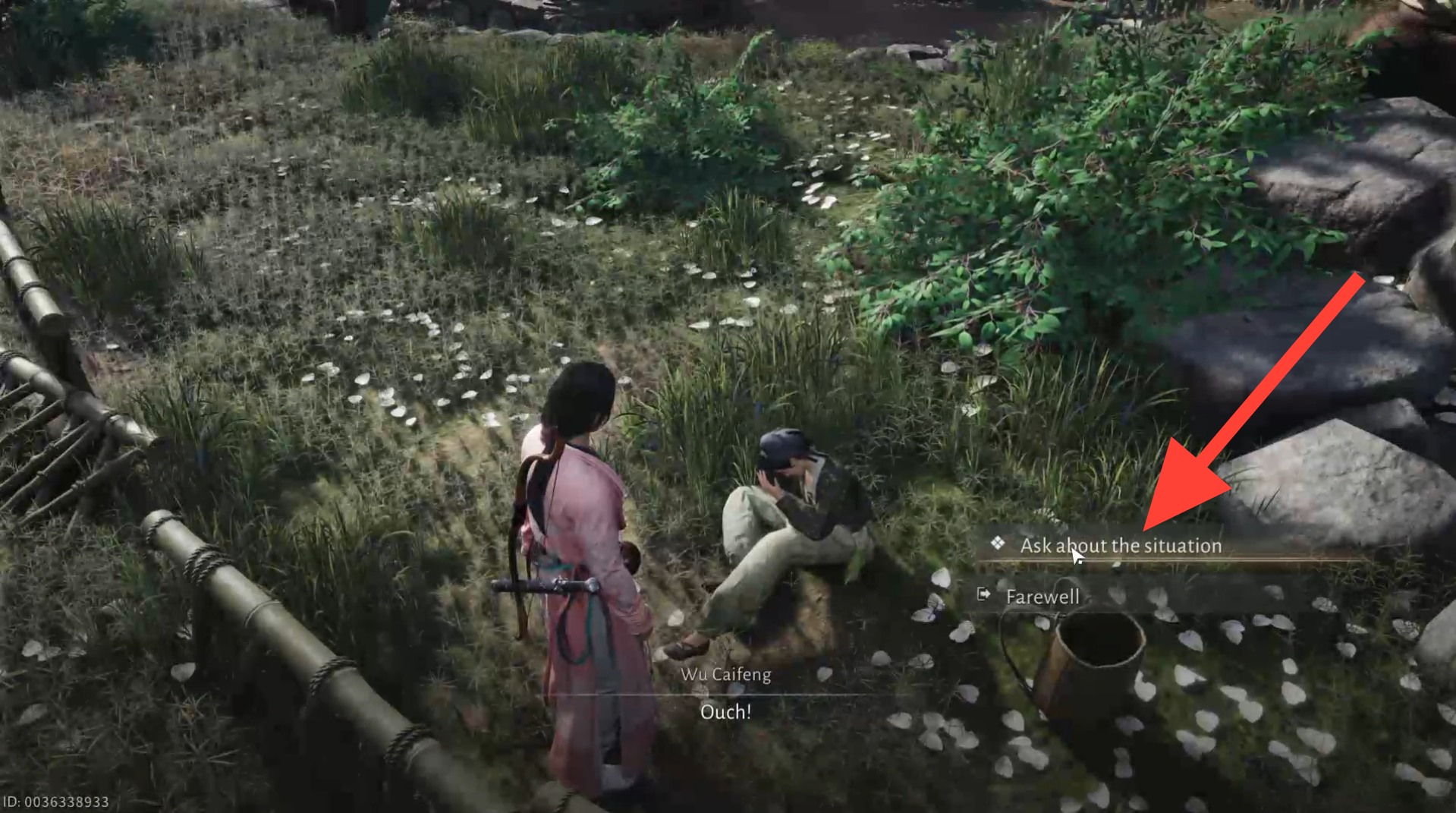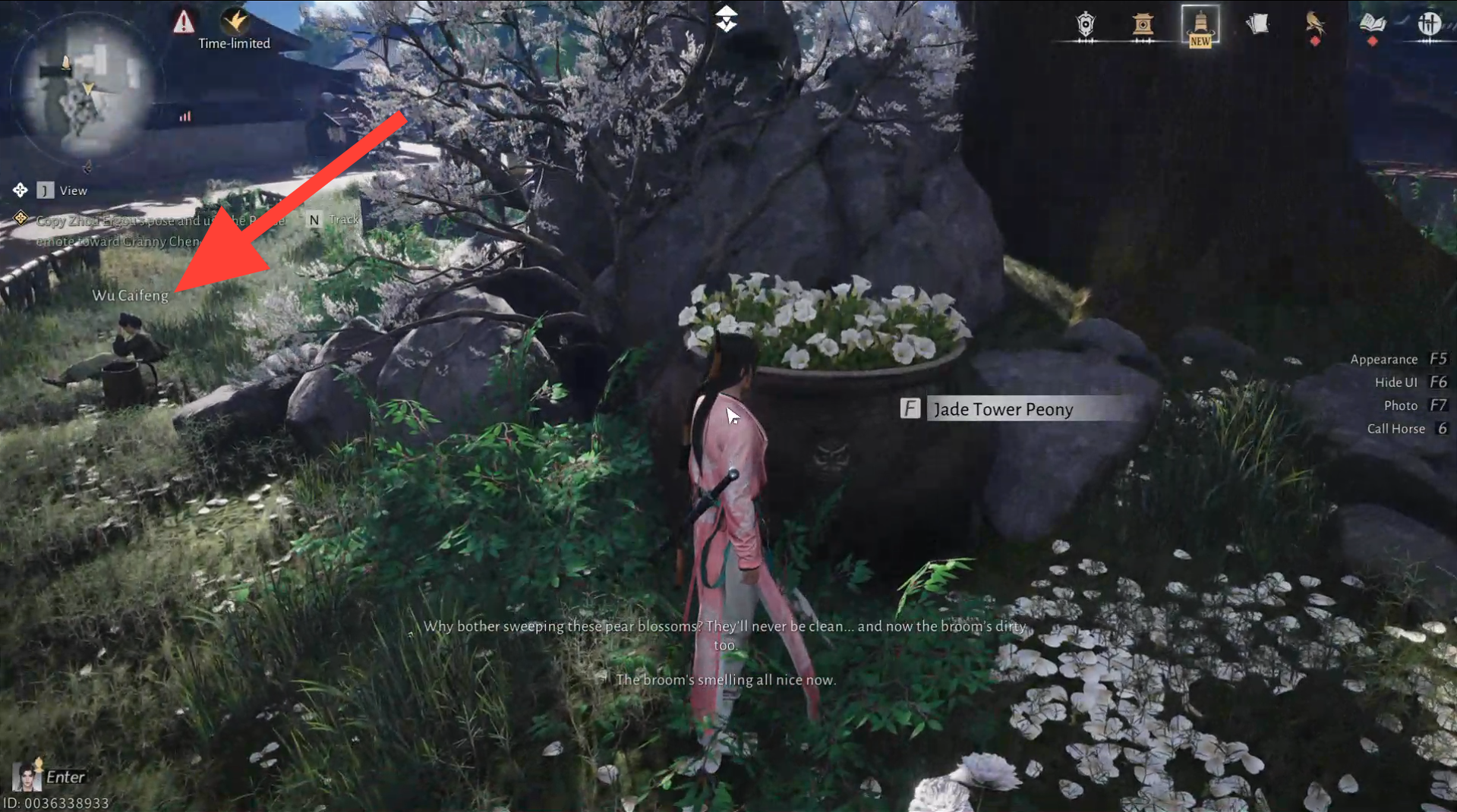 Speak with Wu Caifeng sitting under the Pear Blossom tree to start the quest.