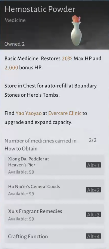 You’ll need to submit 1 Hemostatic Powder to Wu Caifeng to finish the quest. You can obtain it from Xiong Da the Peddler at Heaven’s Pier, Hu Niu’er’s General Goods, Xu’s Fragrant Remedies, or by crafting it yourself.