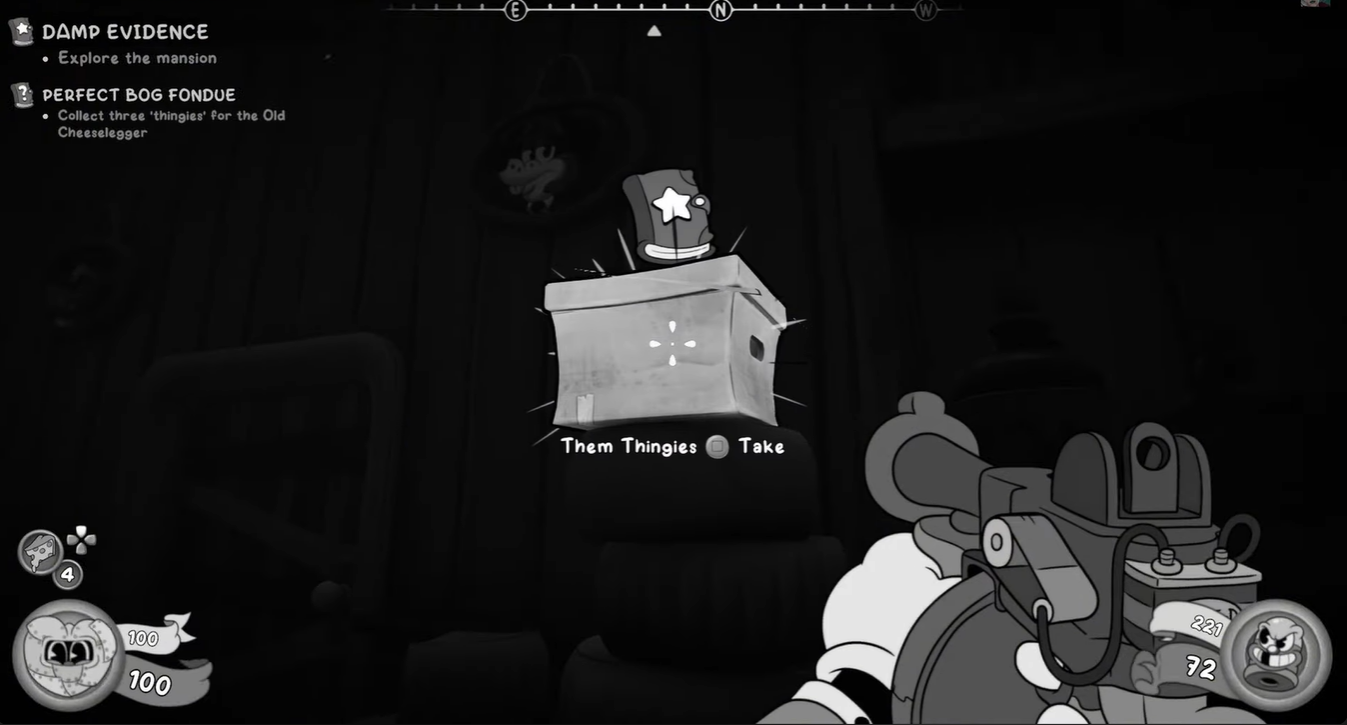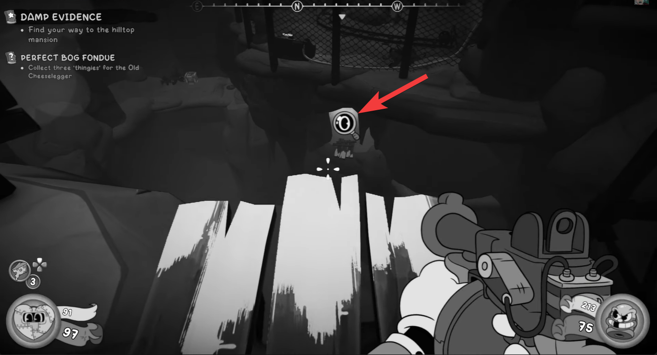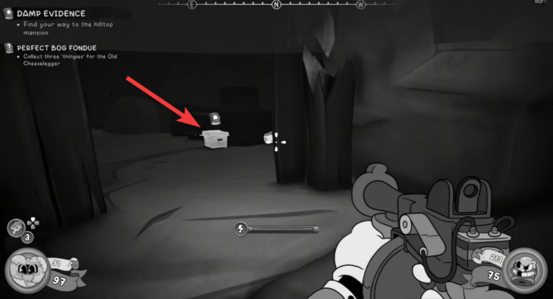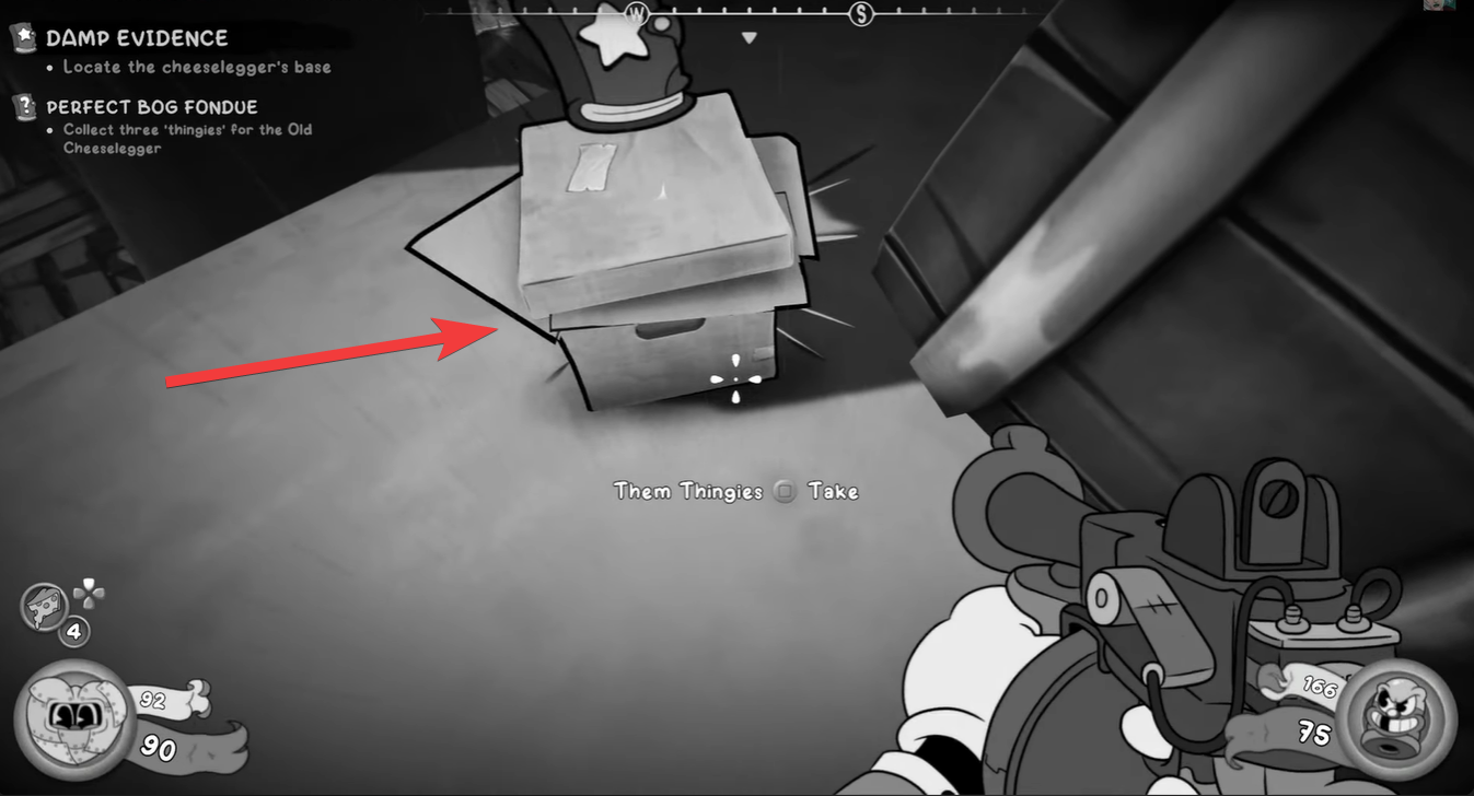 Enter the cave and search inside to find a white box with a block of cheese, which counts as the first Them Thingy.