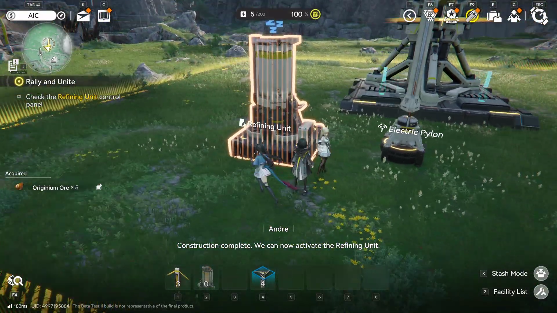 In Rally and Unite, you mine Originium Ore, then place a Refining Unit in the projected placement area by the POC to start converting ore into Origocrusts for progress-gating repairs and crafting. The same mission flow also introduces powering buildings via Electric Pylons and interacting with facility control panels.