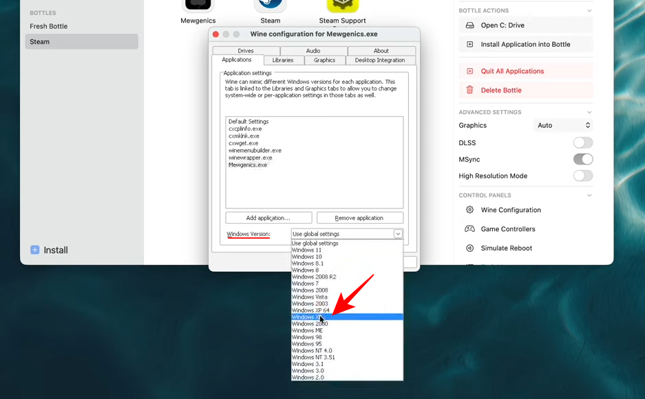 With Mewgenics.exe selected in the list, change the Windows Version to Windows XP.