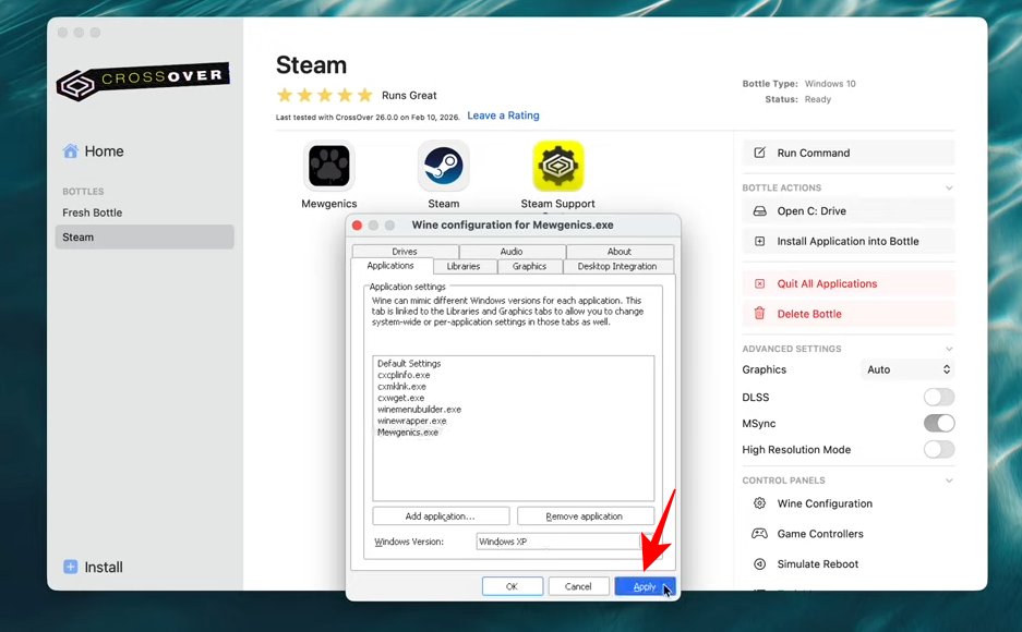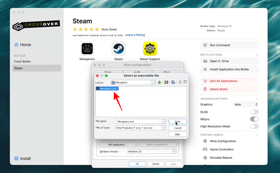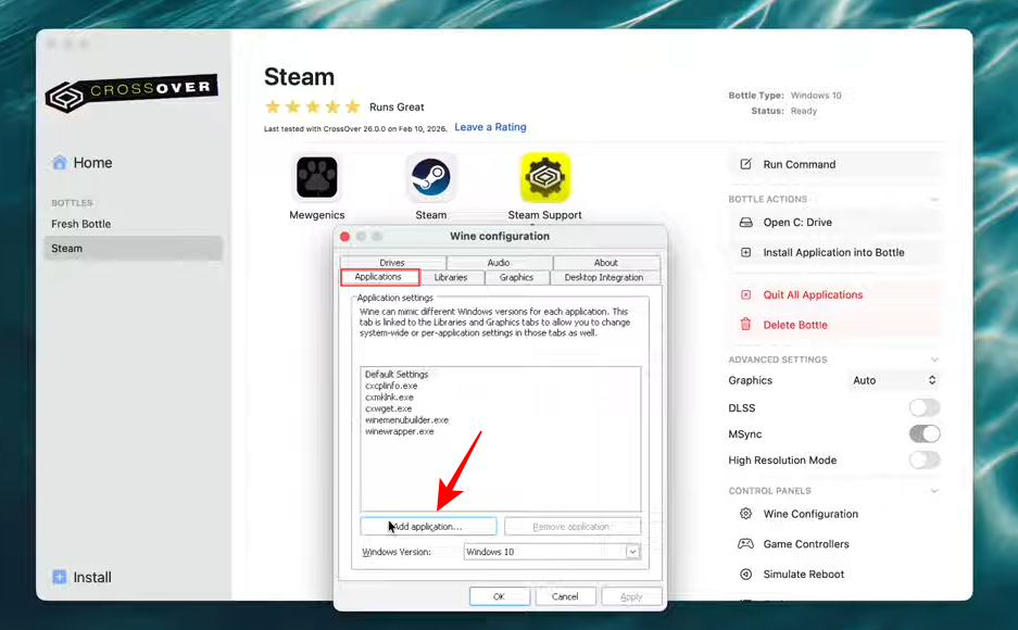 In CrossOver 26, select your Steam bottle and click on Wine Configuration.