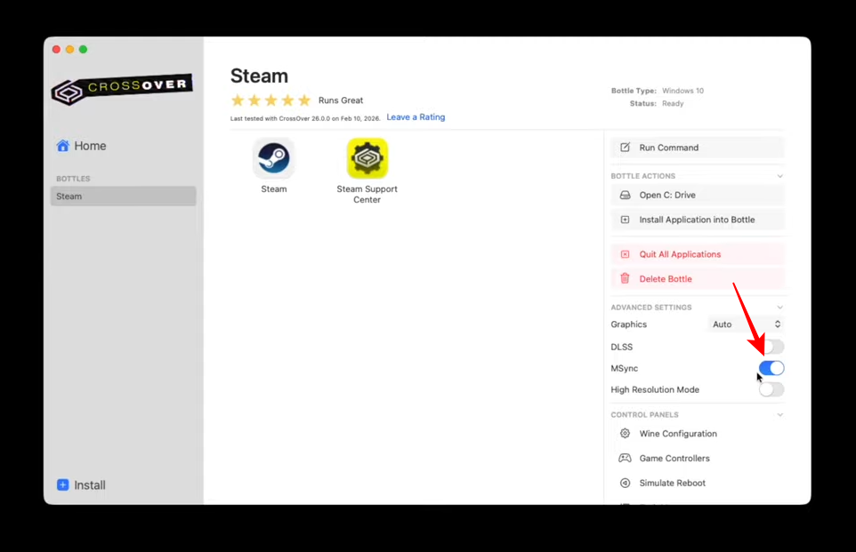 Enabling MSYNC is critical for maintaining stable performance within the Steam bottle.