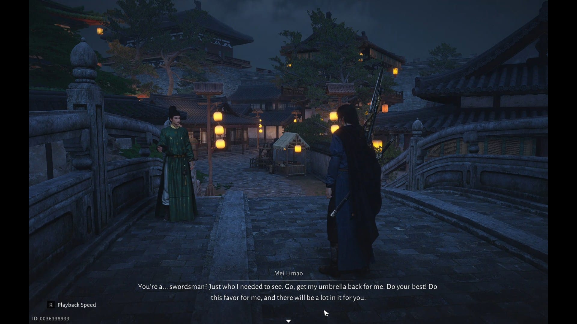 After a brief discussion, Mei Limao will direct you to find his lost umbrella that he last saw move northeast.