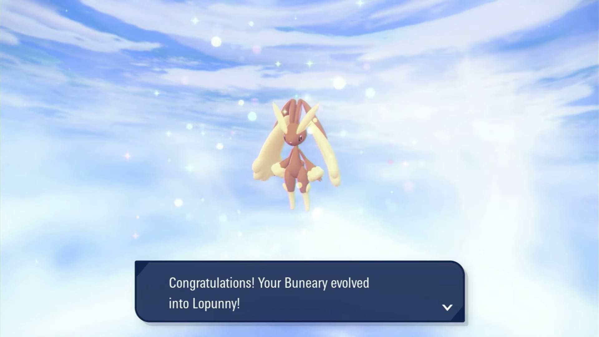 A glowing arrow icon beside Buneary’s portrait indicates evolution readiness. Select Buneary, choose “Evolve,” and watch it transform into Lopunny without leveling up.