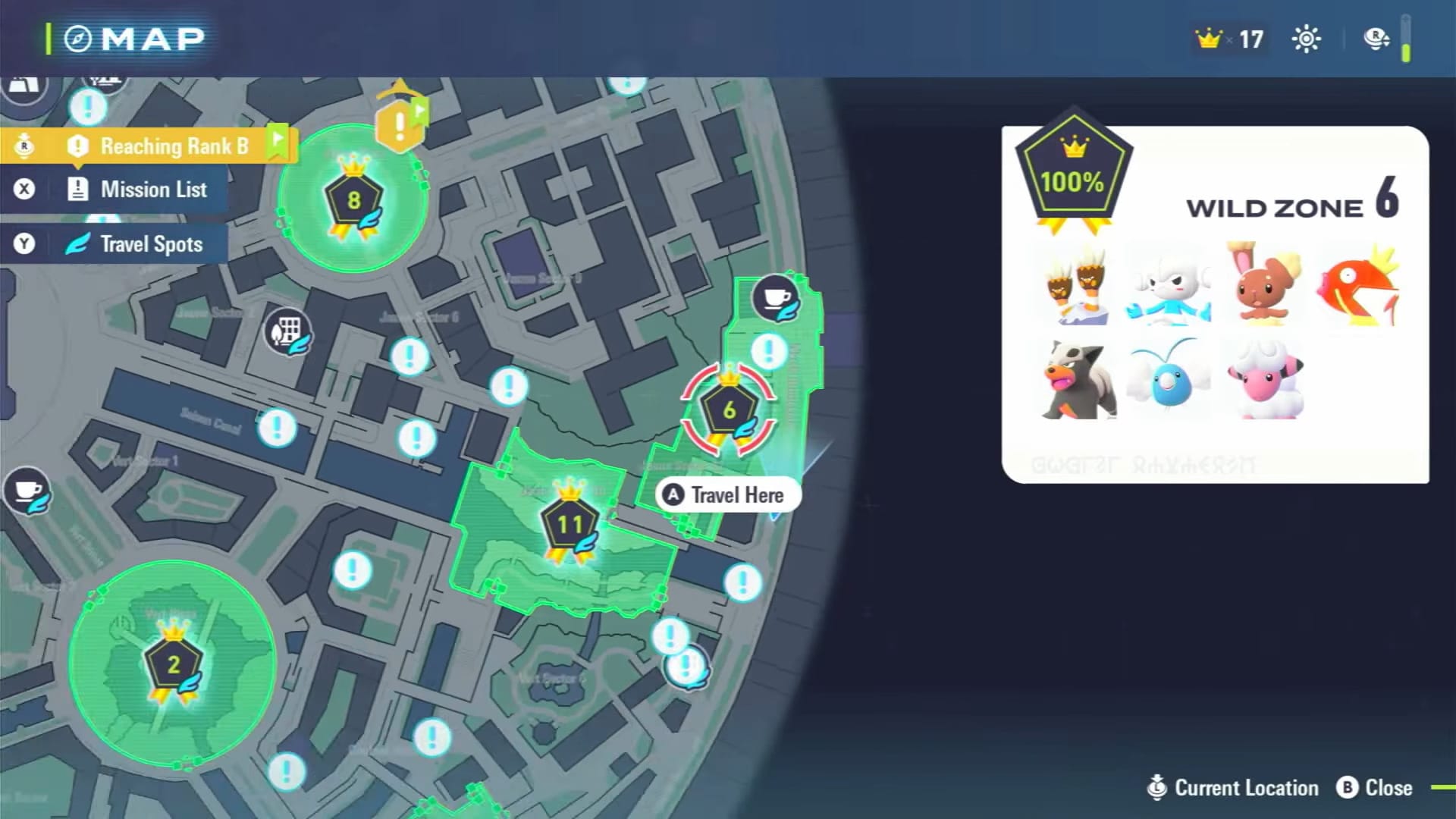 Wild Zone 6 unlocks after Main Mission 6 in Jaune Sector 12 of Lumiose City. Heading north from the southern entrance, cross the wooden bridge over the shallow pool. Groups of Buneary spawn consistently on the adjacent higher terrain during both day and night cycles.