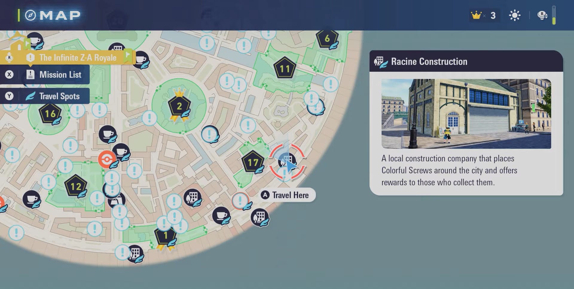 | Racine Construction (Lumiose City) | Complete Main Mission 14: Reaching Rank E | 4,980 Pokédollars | Worker NPC in the garage area |