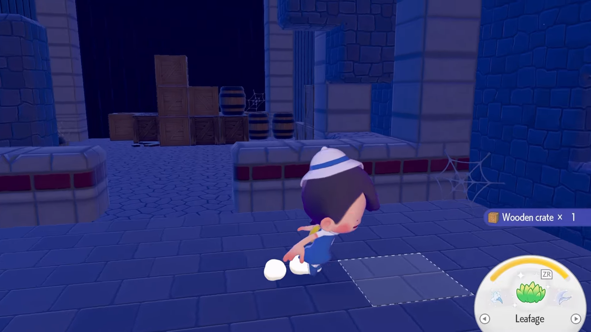 Use the powered-up leafage to create four patches of moss on the ground. Once the moss is ready, place your crate on the floor and position the lantern directly on top of it.