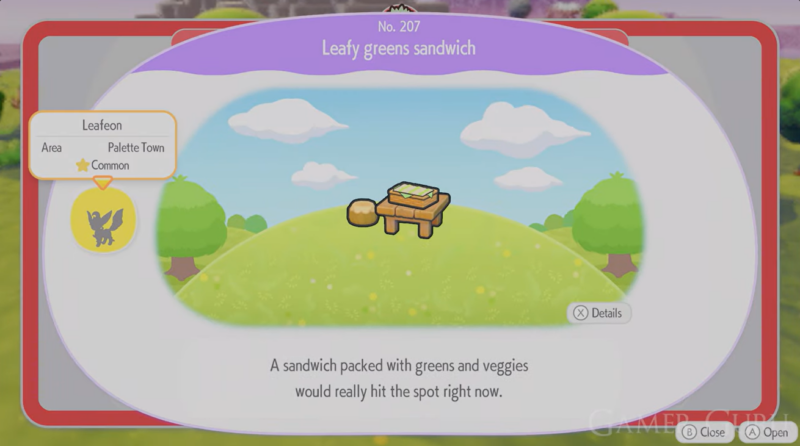 Sandwiches represent a picnic-style habitat that attracts grass-type Pokémon, and when placed correctly they can cause Leafeon to spawn nearby. However, this item cannot simply be crafted or purchased. Instead, you must unlock it through a farming challenge in Pallet Town.