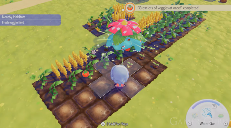 To accelerate the process, bring a plant-type Pokémon, like Venusaur, with you while farming. Plant Pokémon provide a growth bonus that significantly speeds up crop development, letting you complete the fifty-vegetable requirement much faster.