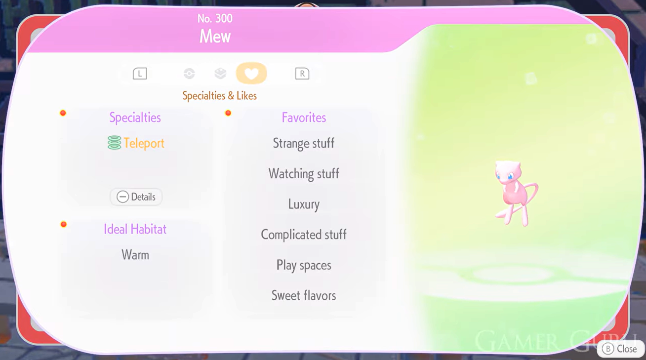 The Pokédex also reveals personality traits and preferences that influence how Mew interacts with habitats and environments.