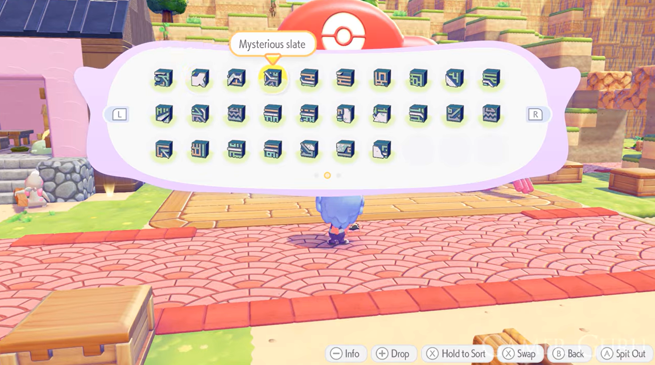 Open your inventory and begin placing the Mysterious Slates into the mural. Holding the X button automatically organizes the slates inside your bag, making it easier to manage them while inserting each piece.