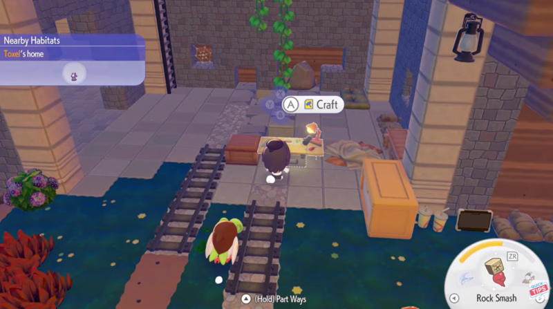 Open the crafting menu in Pokémon Pokopia. This is where all craftable items are organized into categories such as tools, building items, and miscellaneous objects.