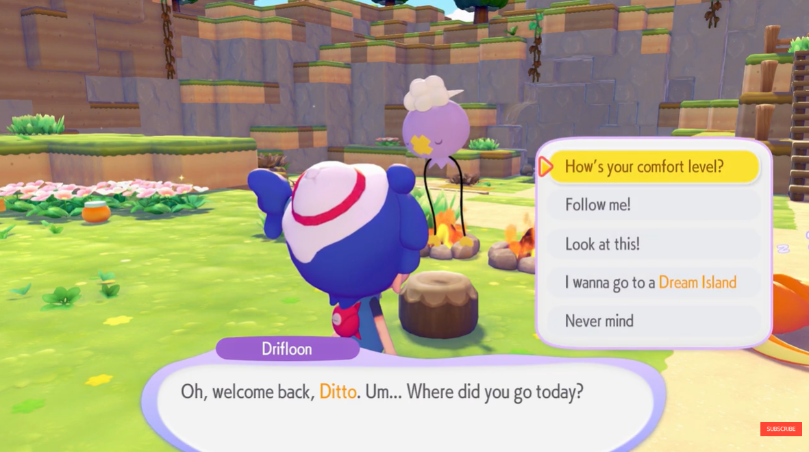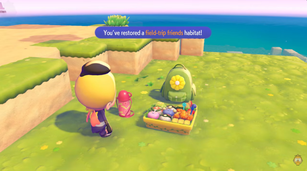 Pokopia uses a habitat attraction system where Pokémon spawn based on environmental themes. The Field Trip Friends Habitat recreates a grassy picnic environment, which matches Skiploom’s nature as a floating grass-type Pokémon that travels with the wind.