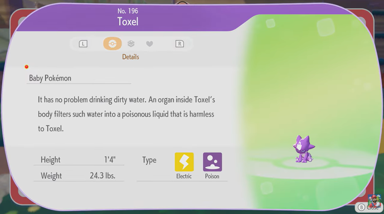 The Pokémon stands about 1 foot 4 inches tall and weighs roughly 24.3 pounds, making it one of the smaller creatures you can unlock in the game. Its Electric and Poison typing gives it unique potential once it evolves later into Toxtricity.