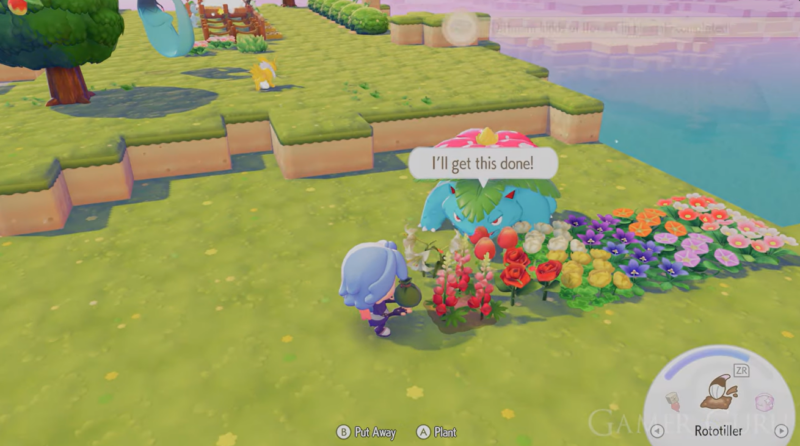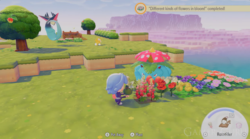 Return to Pallet Town and plant the seeds in available planting spots. Each planted flower counts toward the twelve-flower requirement needed to unlock the reward.