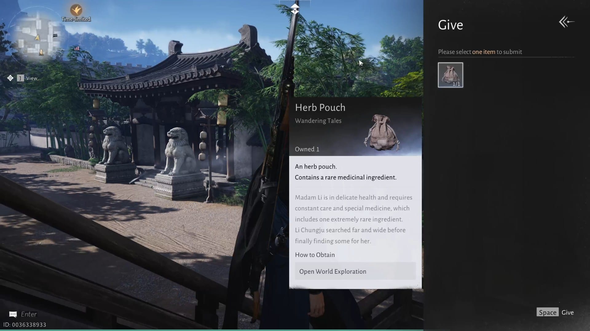 Once acquired, return the Herb Pouch to Xingping. He will be on the stairs.