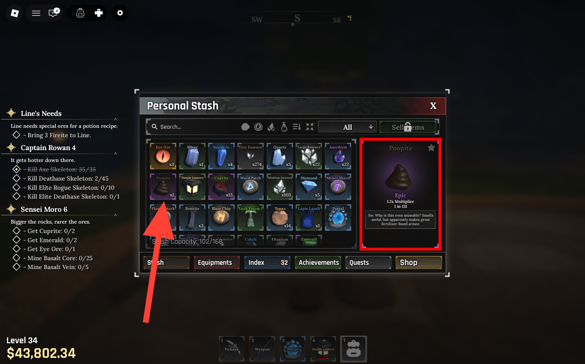 Poopite is a rare, Epic-rarity crafting ore in The Forge, found in the Stonewake’s Cross Cave from Pebbles, Rocks, and Boulders at an approximate 1 in 131 drop chance. Its poop-like appearance carries over to any gear you forge with it, giving weapons and armor a dark brown, textured finish, while also unlocking a powerful low-health poison cloud buff that can turn desperate fights in your favor.