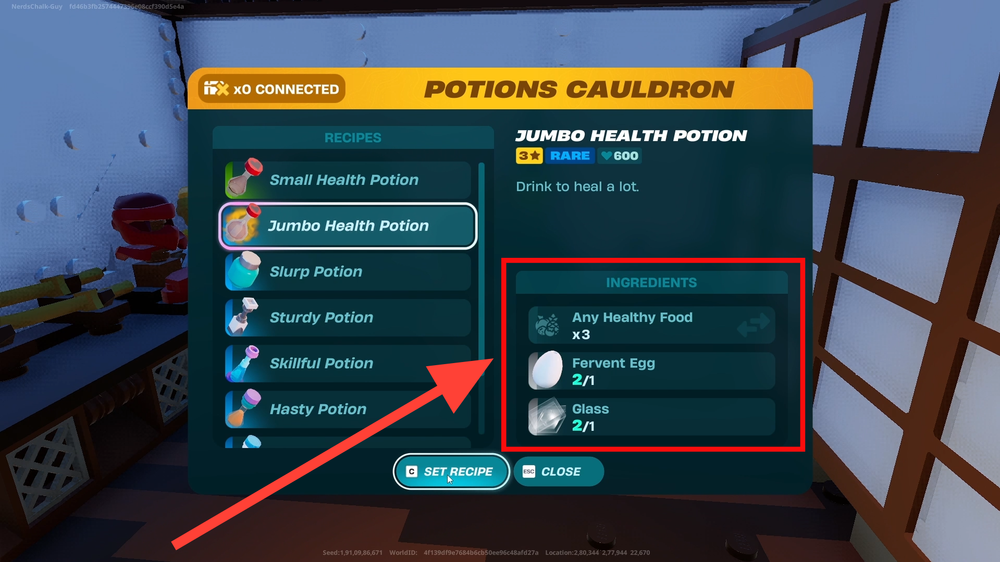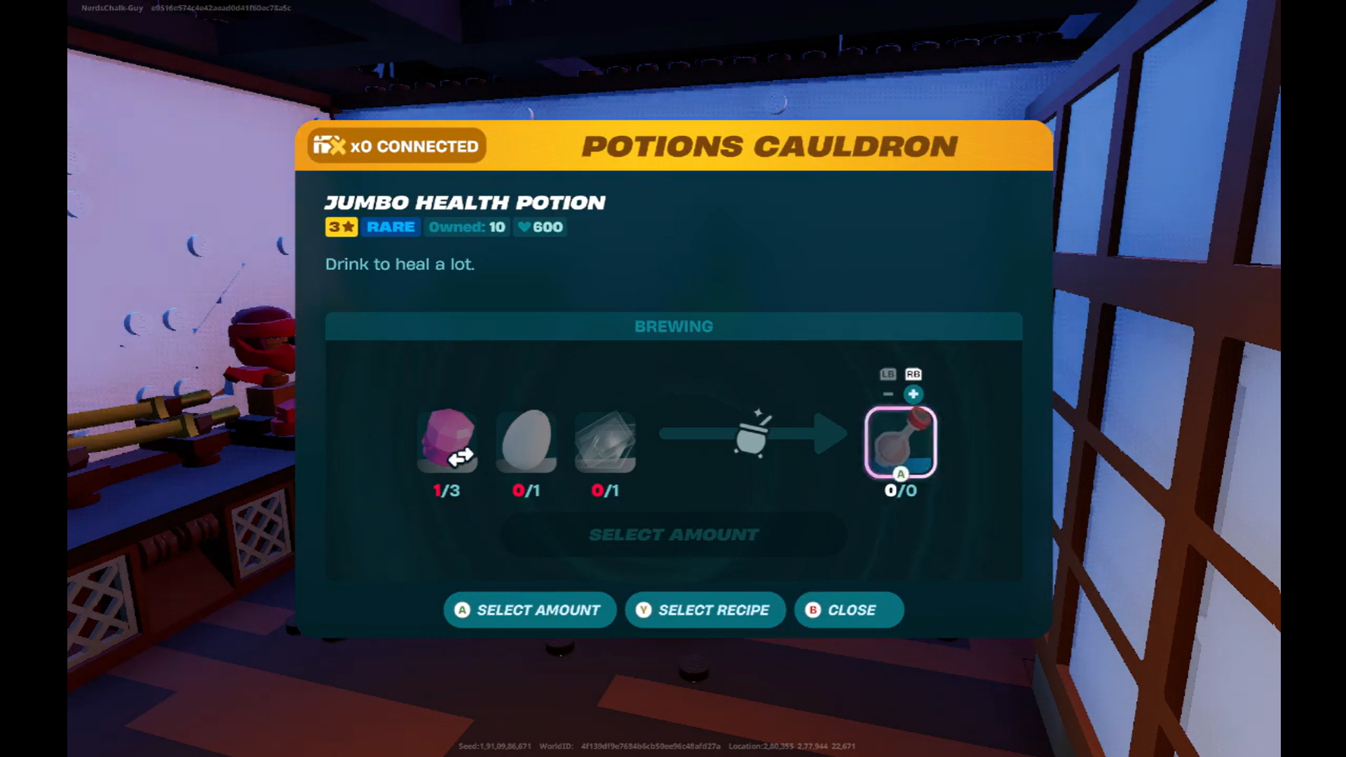 Start at the Potion Cauldron in Ninjago Base. Select any Health Potion to brew. We are going with the Jumbo Health Potion.