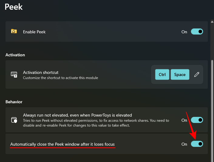Open PowerToys and select ‘Peek’ from the side panel. Then on the right, toggle on Automatically close the Peek windows after it loses focus.