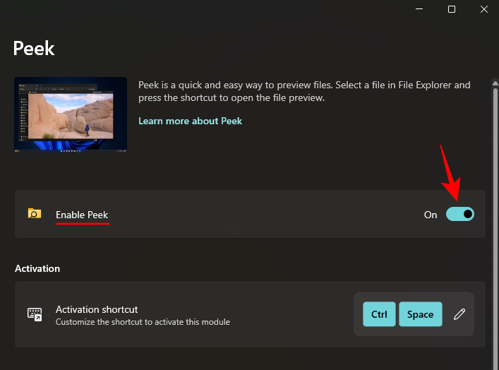 The default shortcut to preview files with PowerToys Peek is Ctrl+Space. You can change this to a shortcut of your liking from the PowerToys Peek settings window by clicking on the pencil icon next to ‘Activation shortcut’. Only shortcuts that start with Windows, Ctrl, Alt, and Shift keys are allowed.