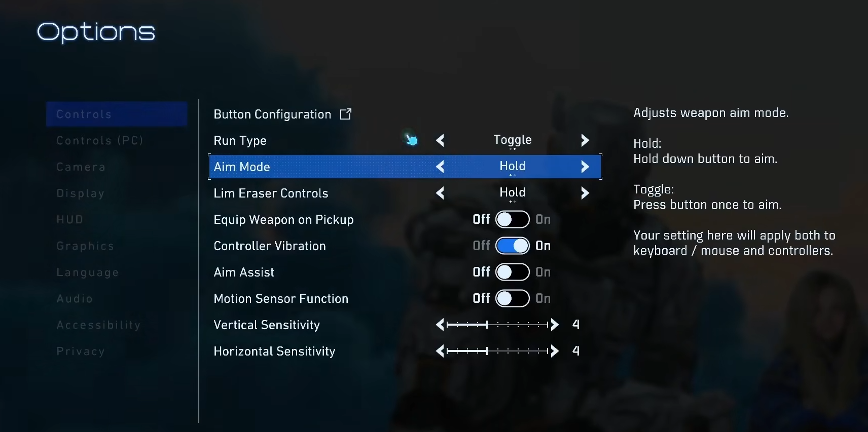 | Aim Mode | Hold (RE-style) or Toggle | Mouse aim sensitivity 33 horizontal/vertical |