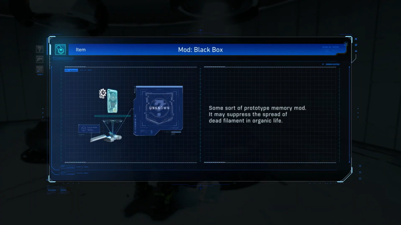 The Black Box mod is one of the most mysterious rewards in the game. Its in-game description suggests it may suppress the spread of “dead filament” in organic life.