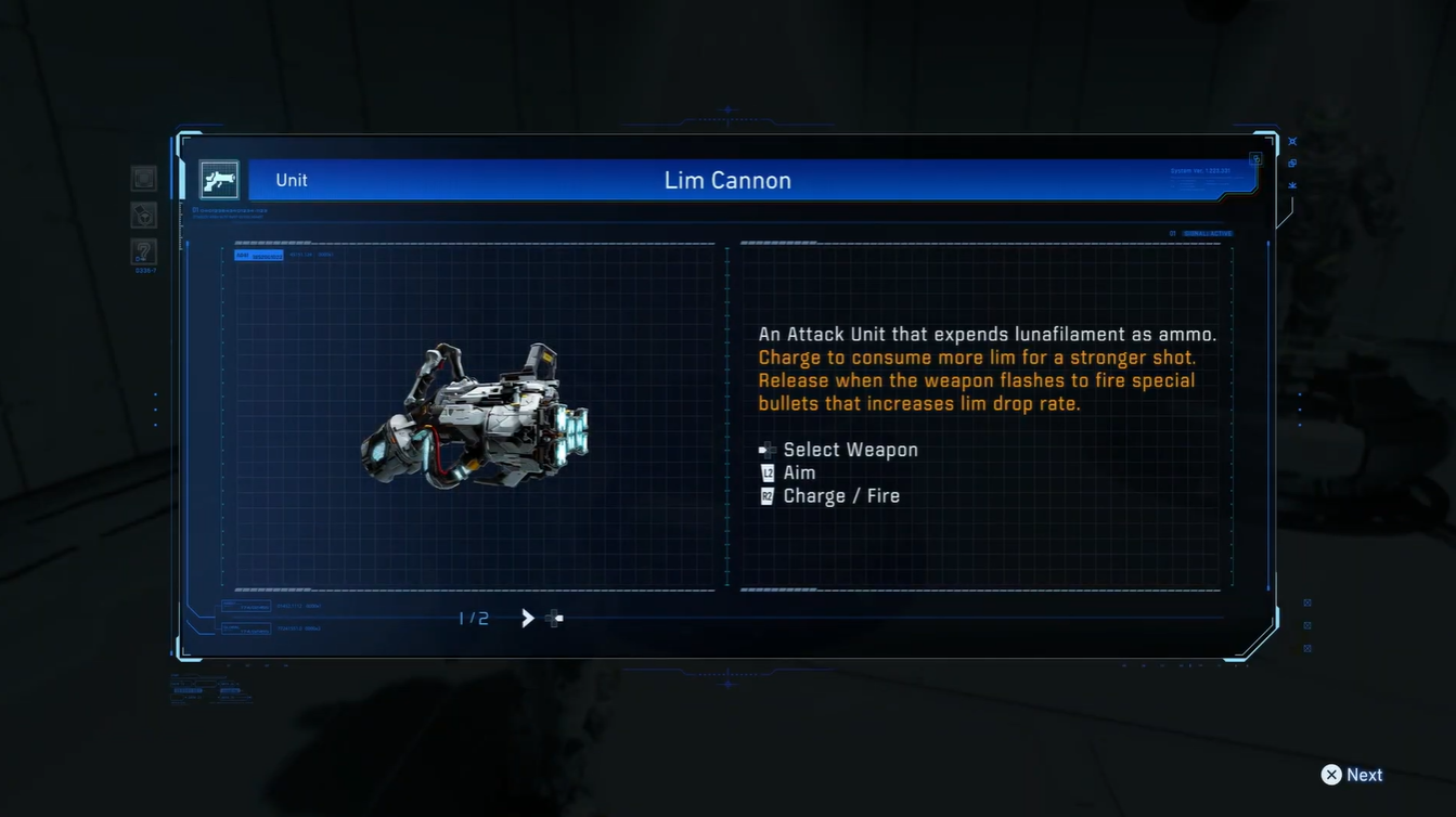 The Lim Cannon is a high-damage attack unit with a base power of 23,000, making it one of the strongest weapons available. It uses lunafilament as ammunition and features a charge mechanic that lets you fire enhanced shots.